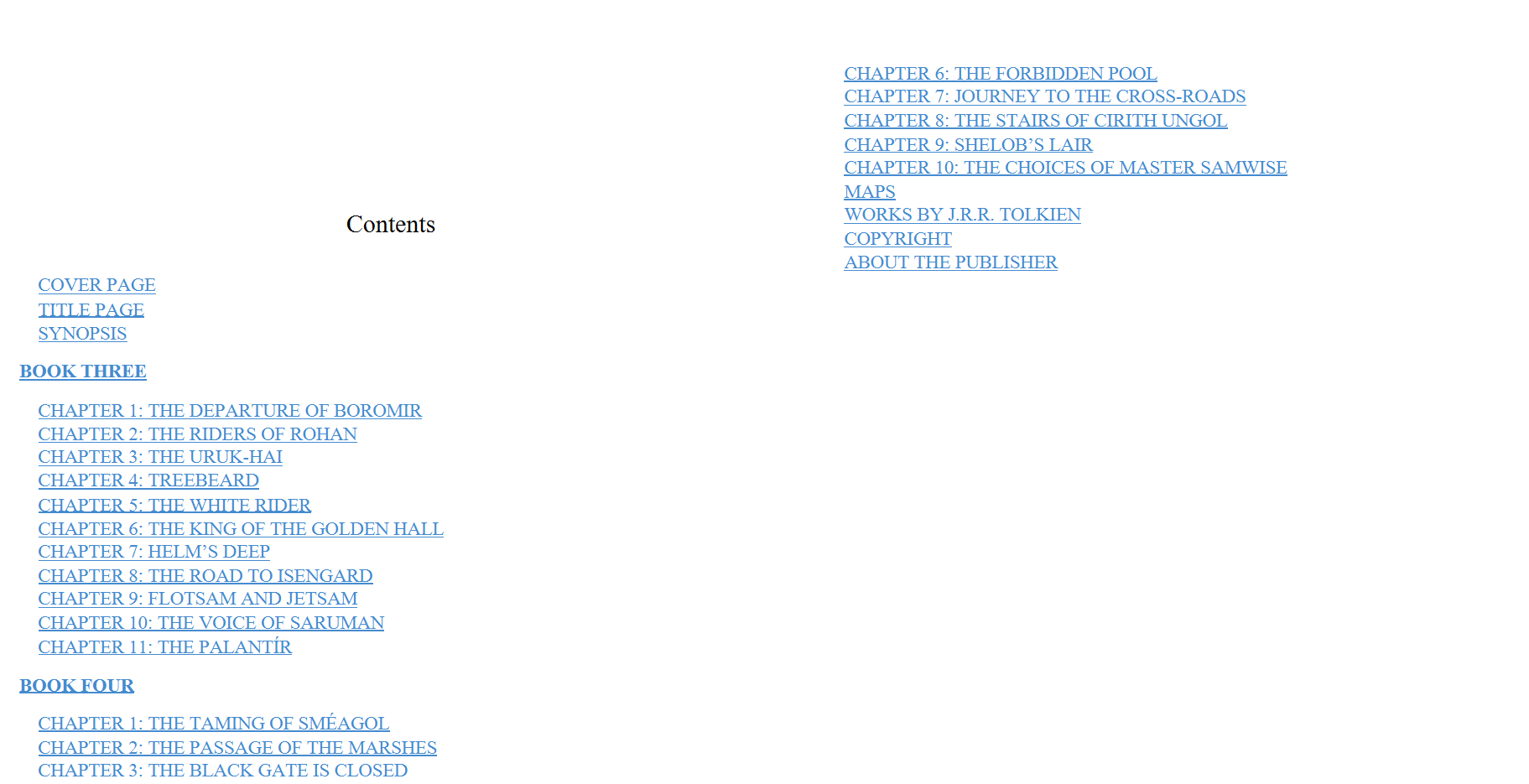 Separated but still united in purpose, the members of the Fellowship press onward against the rising power of Sauron, whose armies of darkness are sweeping across Middle-earth. While Frodo and Sam secretly make their way toward Mordor — guided by the mysterious and treacherous Gollum — Aragorn, Legolas, and Gimli race to defend the free peoples from destruction.